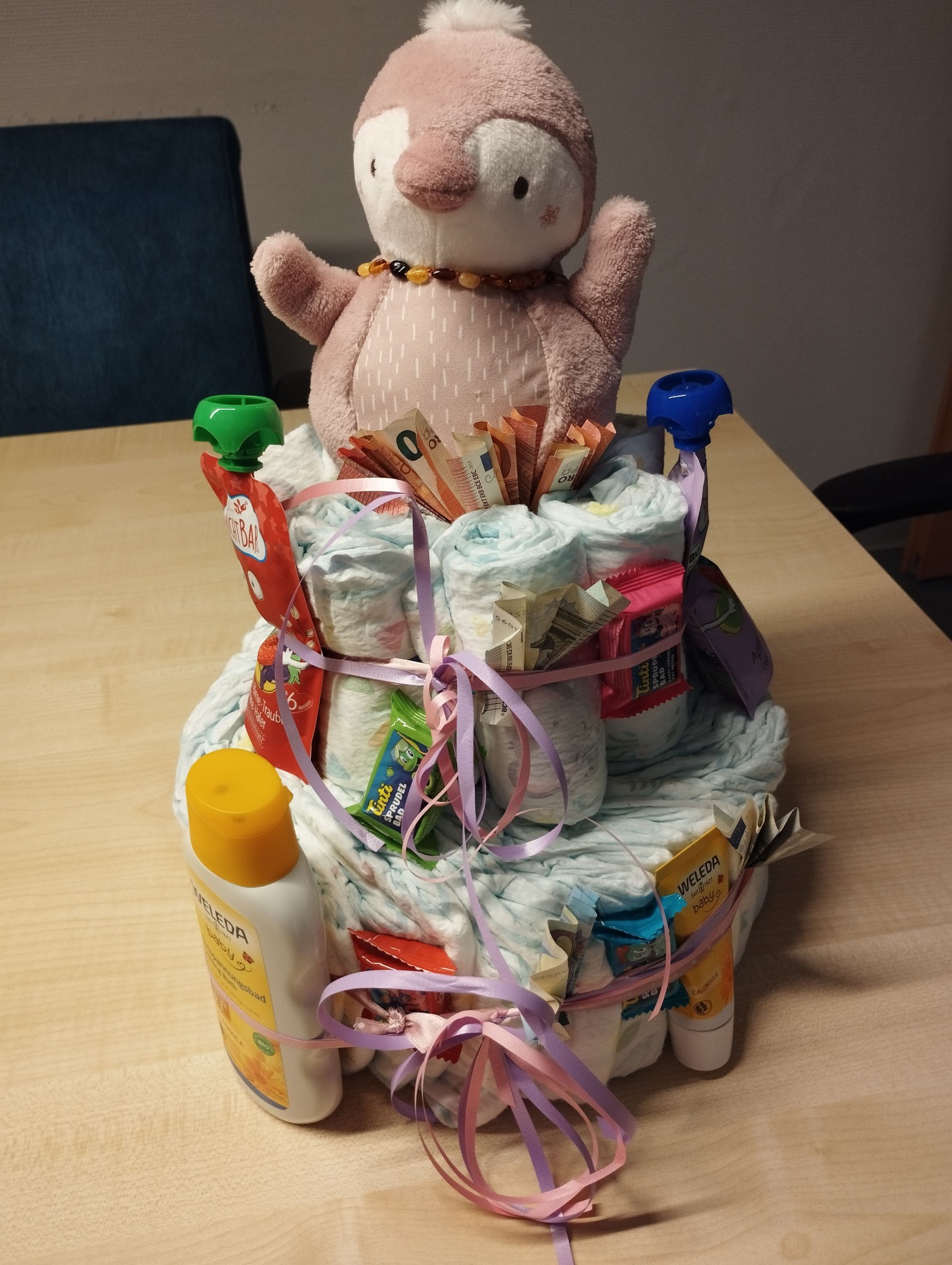 Im Haus St. Vinzenz wurden unsere Mitarbeiter Frau Katona und Herr Ferenczi mit einer süßen Windeltorte zur Geburt ihrer Tochter überrascht! Die Torte, gefüllt mit kleinen, aber feinen Geschenken zur Geburt ihrer Tochter, soll den beiden eine kleine Freude in dieser aufregenden Zeit machen. Wir wünschen von Herzen alles Gute, viel Gesundheit und eine wunderschöne Zeit mit ihrer kleinen Tochter! 💕✨