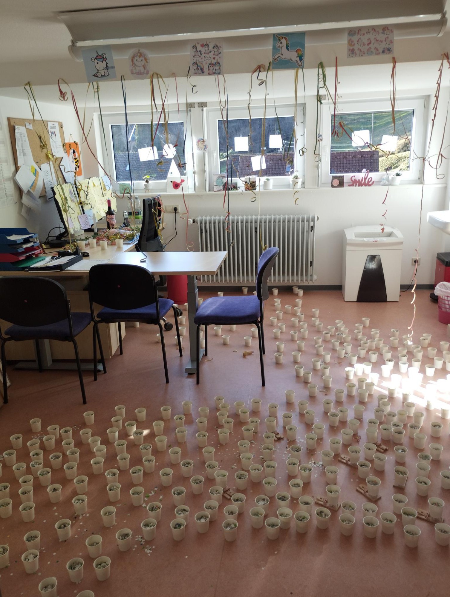 Unsere Kollegin Frau Veronika Schneider aus dem Haus St. Vinzenz wurde kürzlich ein weiteres Jahr älter - und das wurde natürlich gefeiert! 😉 Das Team hatte sich nicht nur die üblichen Glückwünsche auf die Fahne geschrieben, sondern sich etwas ganz Besonderes einfallen lassen, um den Start in den Arbeitstag für Veronika zu einem echten Abenteuer zu machen. 🔎 Hinter Bechern voller Konfetti und ausgelegten Mäusefallen verwandelte sich der Schreibtisch in eine bunte Überraschung. 🥳 Hier ist Platz für eine gute Portion Humor und den ein oder anderen unvorhergesehenen Moment, der den Tag zu etwas ganz Besonderem macht 💚