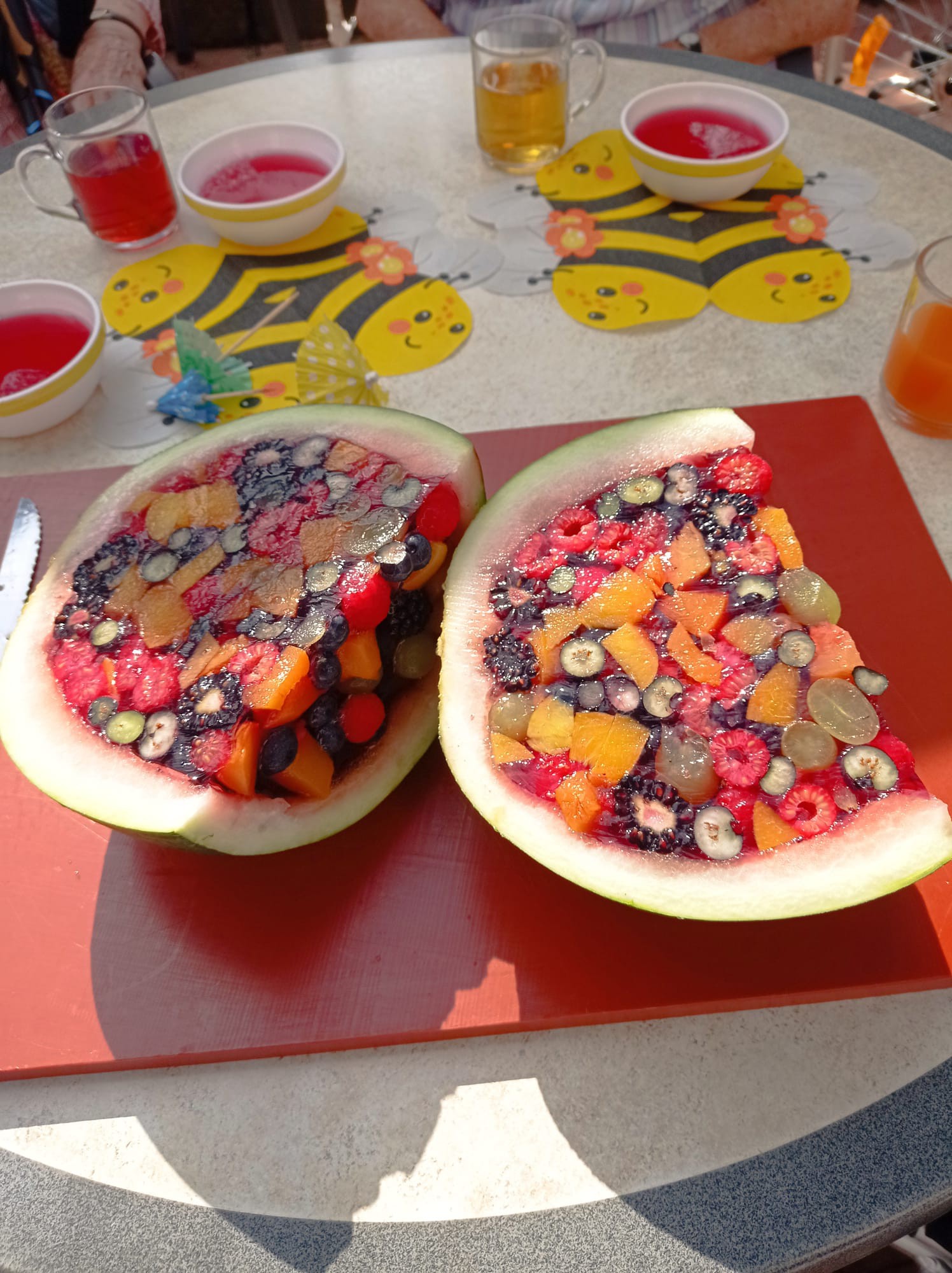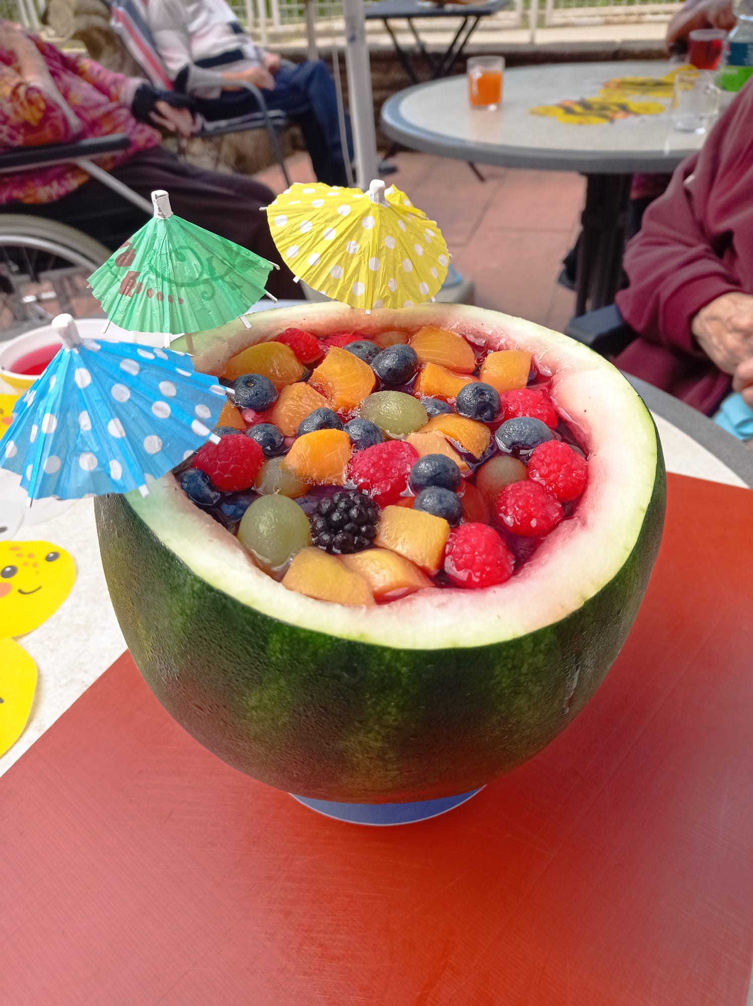 Wenn der Kreativität keine Grenzen gesetzt sind, wird im Haus St. Vinzenz auch mal eiene Wassermelone fix passiert und zu einem leckeren Cocktail umfunktioniert! Das Innere der Melone wurde mit bunten Früchten gefüllt und mit Wackelpudding und Geliermittel über Nacht gekühlt 🧊 Aufgeschnitten ein echtes Highlight! 🌴