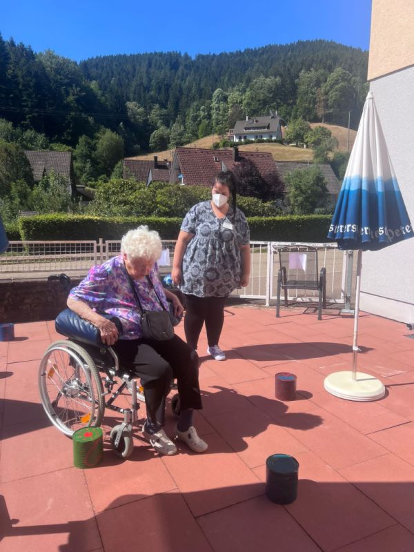 Das Motto war Sturz- und Thromboseprophylaxe. Bei schönstem Wetter wurden auf der Terrasse 4 Stationen aufgebaut mit unterschiedlichsten Aufgaben. Und hier kamen unsere Dosen im Slalomparcours zum Einsatz🤩.