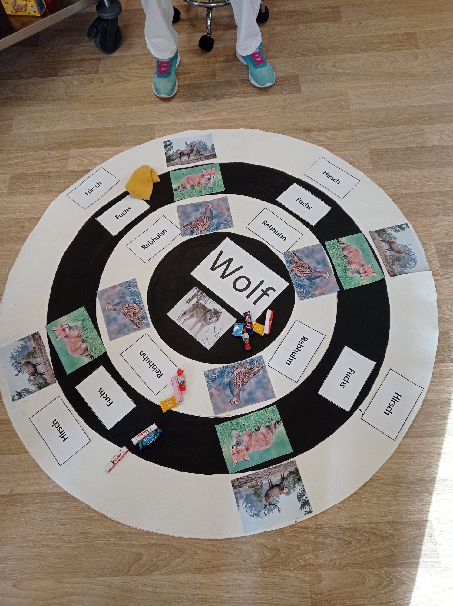 Gemeinsam mit unseren Alltagsbegleiterinnen wurden Esskastanien im Backofen gebacken und dazu passender Jägertee getrunken. 🌰 Das Lied "Jäger aus der Kurpfalz" konnten dabei viele auswendig! 🎤 Ein kleines Quiz stellte die Fragen, welches Obst im Wald zu finden ist. 🫐 Und beim gemeinsamen Wurfspiel, in dem es um die Tiere des Waldes ging, gewann man durch Werfen die ein oder andere Süßigkeit. 🐺