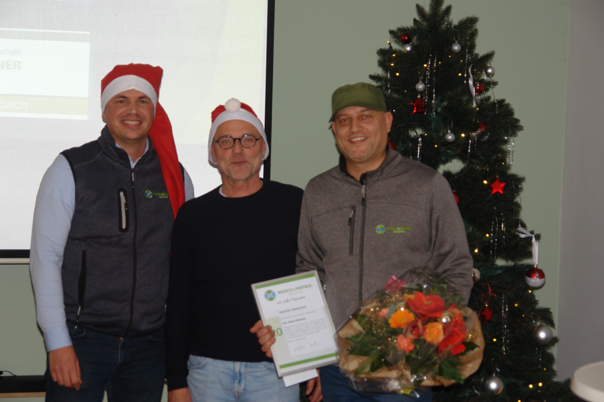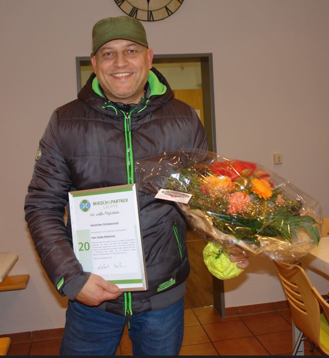 Nach der schon obligatorischen Ansprache von Herrn Grünig, mit einem Rückblick auf das Geschehen des nun ablaufenden Jahres und einen Ausblick auf das kommende Jahr 2024, wurde der Bereichsleiter des „Hauses am Erlenbach“, Herr Mestrovic für sein 20-jähriges Firmenjubiläum bei der Sozialen Betreuungsgemeinschaft Miksch & Partner durch den Geschäftsführer Herrn Mückstein geehrt 🤩