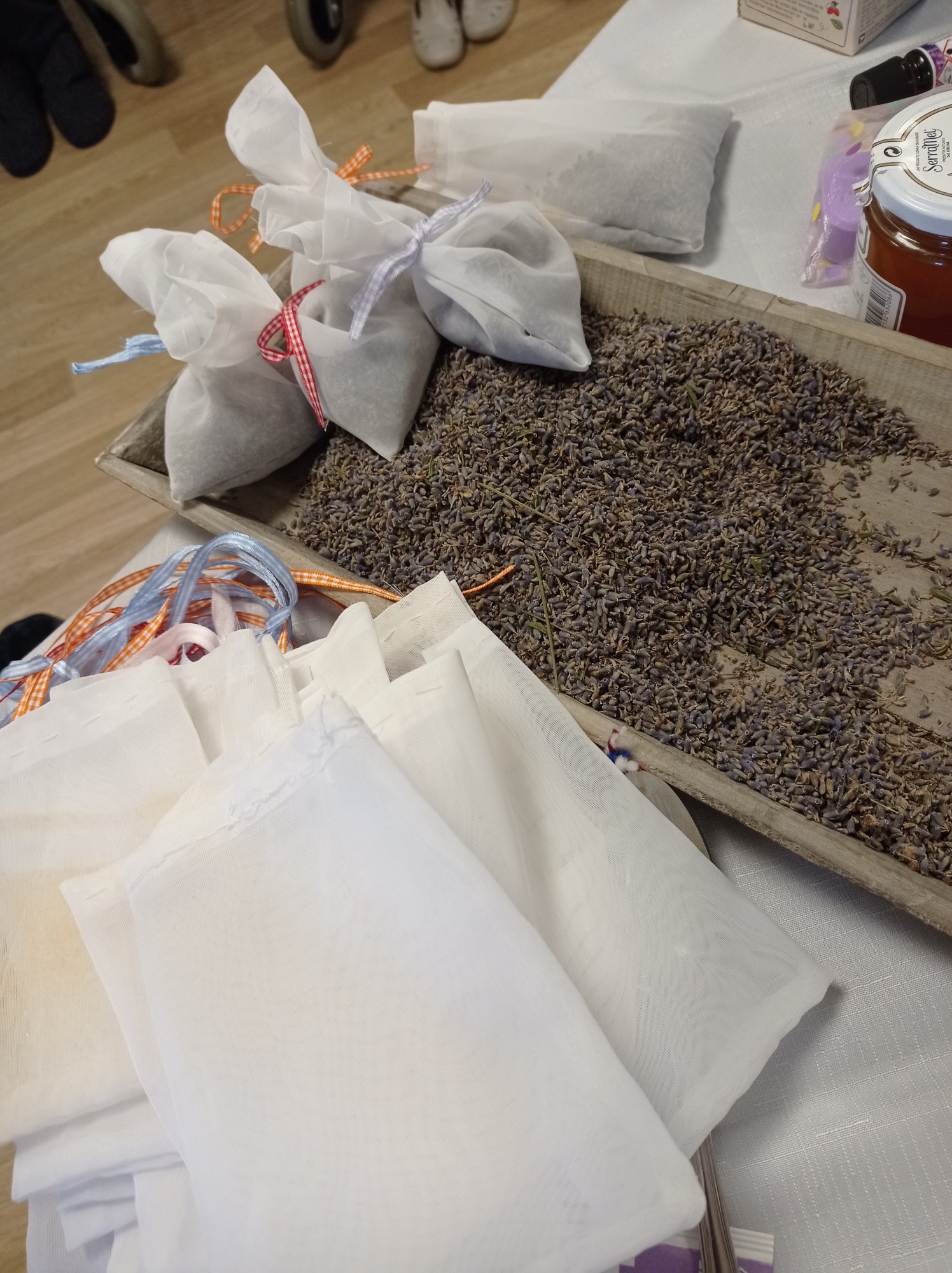 Anschließend wurde gemeinsam mit den Bewohner:innen die Lavendelsäckchen zum Verschenken an die Angehörigen oder für den Eigenbedarf befüllt. Für die Aktivierung der Feinmotorik sorgte das Zuknöpfen der Säckchen ☝️