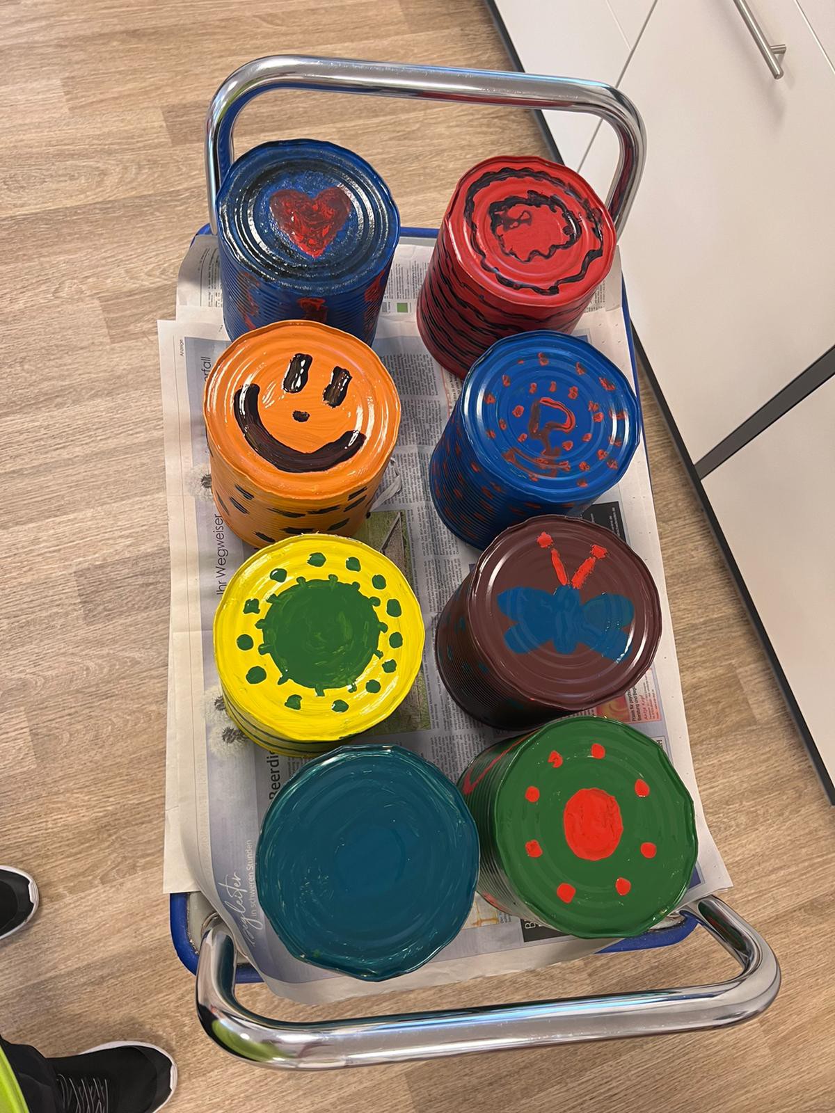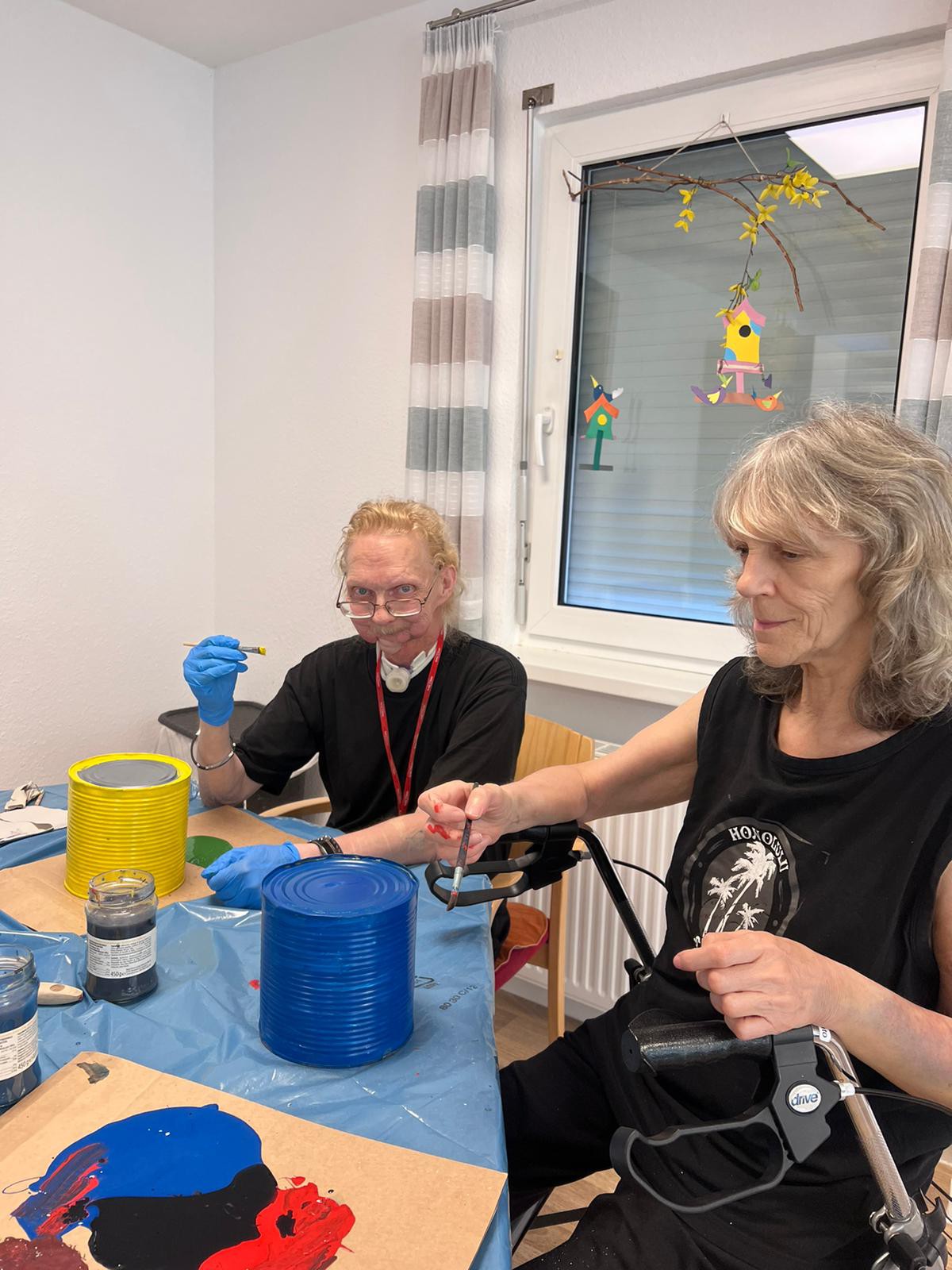 Auf dem Foto gestalten die Bewohner/innen in liebevoller Hingabe alte Konservendosen.